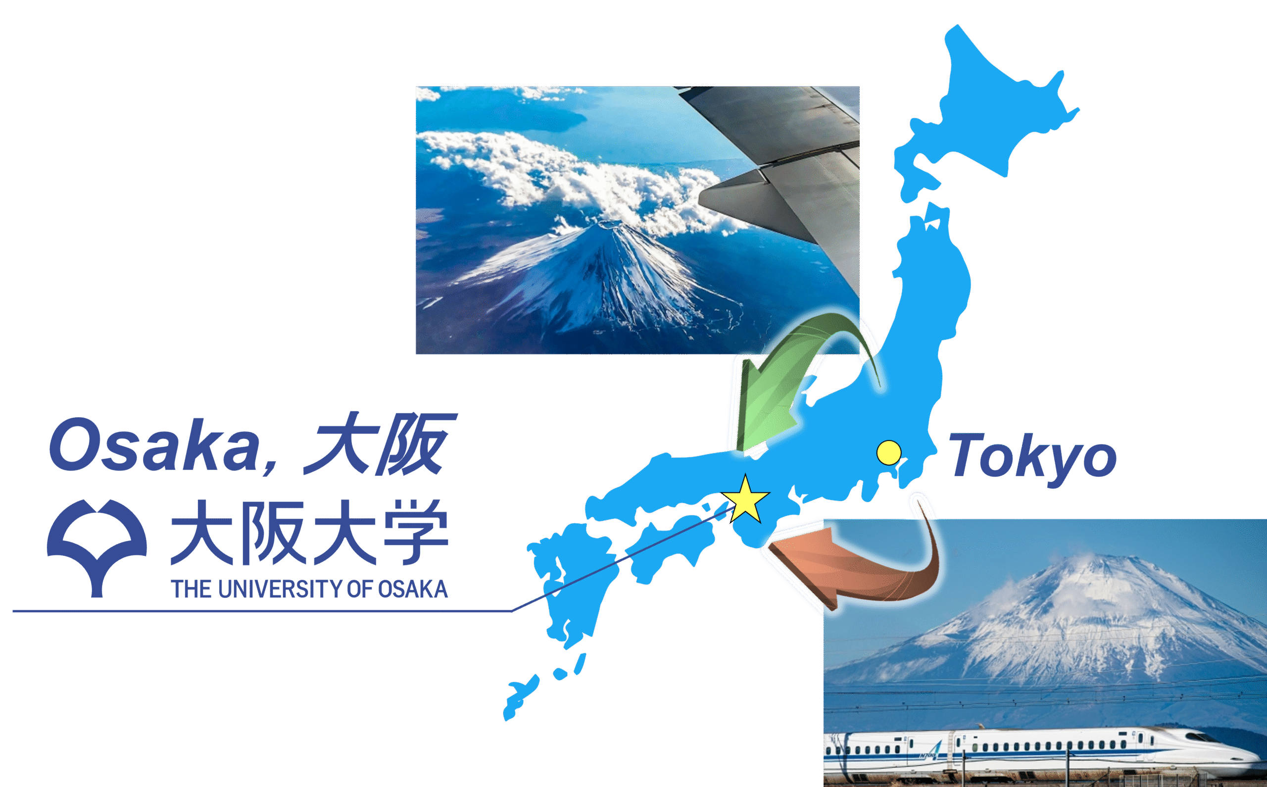 There are direct flights from major cities around the world to Osaka (Kansai International Airport). In addition, there are about 30 flights daily between Tokyo (Haneda Airport) and Osaka (Itami Airport). The flight time is about one hour.